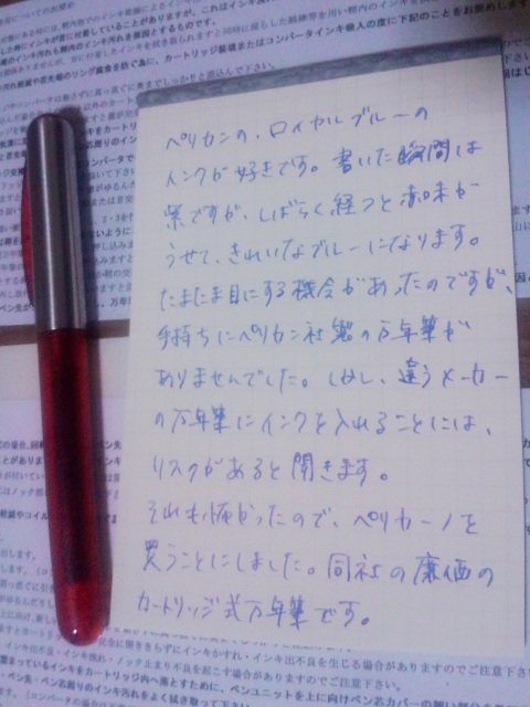 同系統のペリカーノJrという万年筆は、よく文具店でも見かけますが、このペリカーノのほうは、すでに廃番になっているらしいです。地元の万年筆専門店に残っていたのが、赤とオレンジしかなくて、使いたいインクがロイヤルブルーなだけに、本当は青が欲しかったのだけれど、まあないならしかたないかと妥協しました。ペリカーノジュニアにしてもよかったんだけど、そっちはちょっとデザインが可愛らしすぎた。