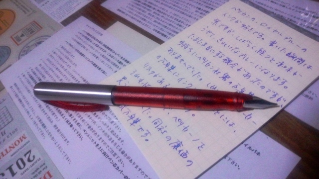 ちょっと前にLAMYのSafariを買ったときにも思ったけど、なんとなく、丸っこい字になる気がします。日本製のはそんなことなくて、なんとなく流れるような字になります。自分が書くと残念な感じですが、達筆の人が書いたら美しくなるんだろうなという線。