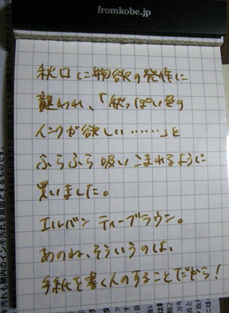 ということで、秋っぽいインクなんて買っても、有効活用的な意味ではとても微妙なのですが、しかし、セピア色のインク、目に楽しいです。使ってて幸せになれるから、まあいいか……。