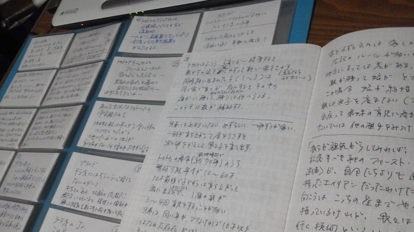 とにかく忘れないうちにと思って、片端からメモをとっているので、メモとネタ帳が膨れ上がっていて、本文で使うかどうかもわからない大量の切れ端が、ひたすら散乱している現状です。